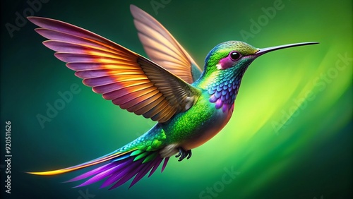 Vibrant, iridescent hummingbird icon with outstretched wings and slender beak, set against a bright green background, symbolizing energy, beauty, and delicate nature.