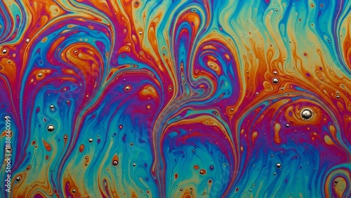 Vibrant iridescent soap film with swirling colors of purple, blue, orange, and yellow, interspersed with tiny shimmering bubbles.