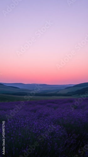 Vibrant lavender blossoms stretch across the landscape, while a gentle sunset casts soft hues of pink and purple in the sky. Rolling hills frame the serene setting, evoking tranquility
