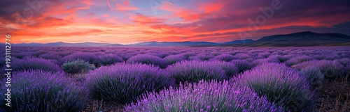 Vibrant Lavender Fields Under a Colorful Sunset Sky in Nature