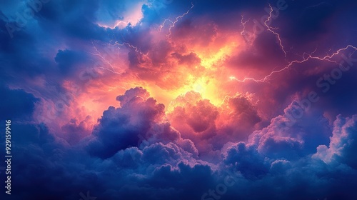 lightning, storm, cloud, fiery, vibrant, sky, dramatic, nature, weather, sunset, electric, powerful, energy, moody, atmospheric, intense, thunderstorm, cloudscape, orange, red, purple, illumination, celestial, tempest