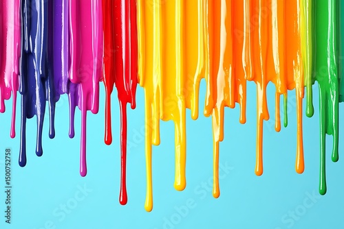 Vibrant liquid dripping in a rainbow cascade from above, forming elegant, lace-like patterns on a colorful background.