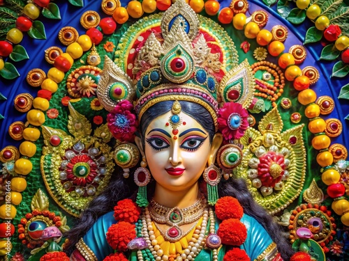 idol, goddess, festival, celebration, worship, colourful, decoration, hindu, tradition, spirituality, culture, religious, divine, art, sculpture, ceremonial, vibrant, faith, devotion, ornate, background, beauty, prayer, ritual, symbol, attribute, strength, feminine, energy, auspicious, festive, joy, reverence, indian, meditative, peace, empowerment, illumination, heritage, craftsmanship, design, grace, colours