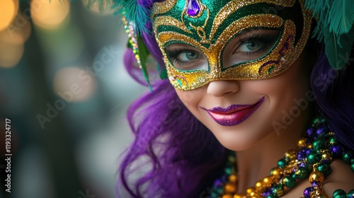 Vibrant mardi gras mask on smiling caucasian woman with purple hair. Mardi Gras, Fat Tuesday, Carnival Season. Bright Parades, Masks, Festive Costumes, Vibrant Atmosphere