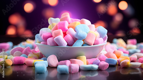 Vibrant Marshmallows Scattered on a Table with Glimmering Festive Lights in the Background. Generative Ai.