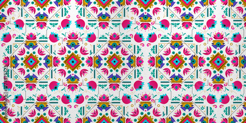 Vibrant Mexican Folk Geometric Floral Pattern in Pink and Teal