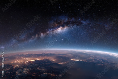Vibrant Milky Way Galaxy Displays Over Illuminated City Lights Earth Curvature Beneath Starry Night Cosmic Scenery