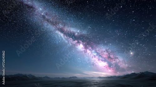 Vibrant Milky Way Over Rural Grassy Landscape Under Clear Dark Blue Night Sky with Starry Pattern and Horizon Glow