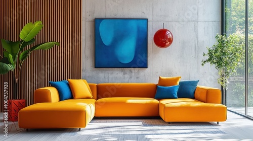 Vibrant modern living room, colorful L-shaped sofa, yellow and orange upholstery, blue throw pillow, wooden slat wall, concrete wall, large window, sunlight and shadows, minimalist decor, potted plant