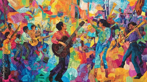 Vibrant mural depicting musicians playing instruments in a lively street festival scene