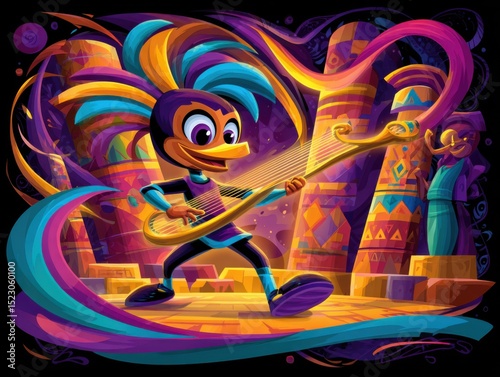 music, performance, illustration, closeup, vibrant, character, style, animation, imagination, scene, inspiration, movement, visual, engagement, dynamic, bold, high-coloured, show, excitement, stage, cultural, carnival, festivity, spirit, guitar