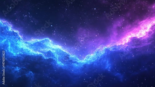 Vibrant nebula, cosmic dust and gas clouds in shades of blue and purple, forming a V-shape against a starry backdrop
