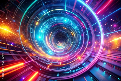 Vibrant neon lights swirl through a futuristic digital vortex, creating a mesmerizing abstract background with a sense of advanced technology and innovation.