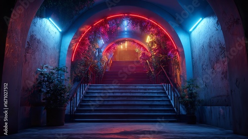 Vibrant neon-lit staircase leading to arched passages in a dramatic setting at night