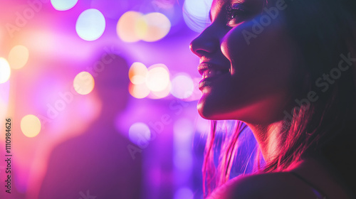 nightlife, neon light, woman, bokeh, cinematic, party, vibrant, nightclub, modern, closeup, colourful, glow, atmosphere, evening, celebration, energy, trendy, city lights