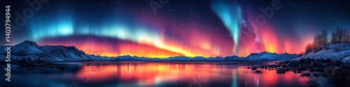 Vibrant Northern Lights Illuminate the Arctic Landscape With Reflections on a Tranquil Lake at Twilight in This Breathtaking Natural Display