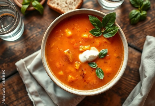 soft, chilled, bowl, soup, cream, water, tempting, texture, tablecloth, juicy, sharpened, kitchen, crouton, vegetable, dish, food, napkin, orange, gazpacho, fresh, savoury, freshness, cosy, creamy, wooden, glasses, rustic, cookery, dollop, warm, inviting, bread, vibrant, basil, sour, appetising, crusty, tasty, table, linen