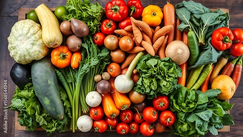 Vibrant organic vegetables arranged on a rustic market table, captured from an overhead angle.