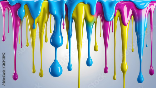 Vibrant paint drips in blue, yellow, and magenta hang against a light background. The glossy, liquid forms create a dynamic and colorful pattern. The image evokes a sense of fluid motion and playful c