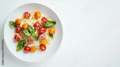 vibrant pasta dish with juicy cherry tomatoes, basil, and parmesan, elegantly plated on a white dish with a minimalist white background to enhance the food's colors.