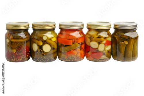 Vibrant pickled vegetables in glass jars against on Transparent PNG format Background.