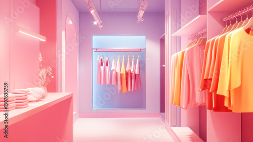 boutique, clothing, display, vibrant, interior, fashion, retail, colourful, pink, blue, hanger, shirt, shop, store, design, modern, trendy, stylish, apparel, elegance, lighting, decor, cosy, arrangement, pastel, aesthetic, shelf, contemporary, rack, textile, garment, shopping, commercial, architecture, chic, luxury, ambience, merchandise, space, layout, decoration, visual, attracted, selection, atmosphere, inviting, sale, consumer
