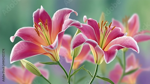 Vibrant pink lilies with soft, blurred background. Petals detailed and illuminated, showcasing beauty
