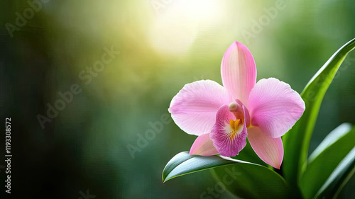 orchid, pink, flower, sunlight, green, leaf, nature, tropical, bloom, plant, exotic, garden, botany, flora, vibrant, delicate, closeup, macro, natural, beauty, serene, peaceful, soft, background, bright, fresh, elegant, floral, lush, colourful, radiant, tranquil, ornamental