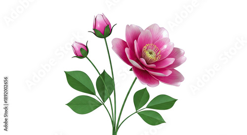 peony, flower, pink, blooming, bud, leaf, green, white background, botanical, floral, nature, spring, summer, garden, delicate, elegant, vibrant, single flower, closeup, illustration, digital artwork, art, decorative, romantic, beauty, stamen, pistil, stem