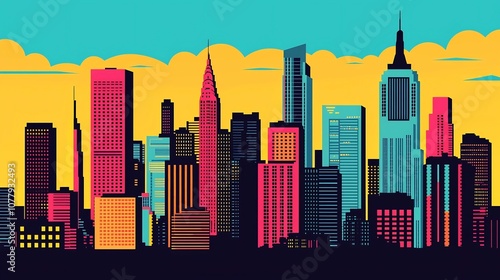 Vibrant Pop Art Inspired Cityscape with Surreal 3D Architectural Elements Striking and dynamic urban landscape with colorful skyscrapers bold geometric patterns and a high energy futuristic feel
