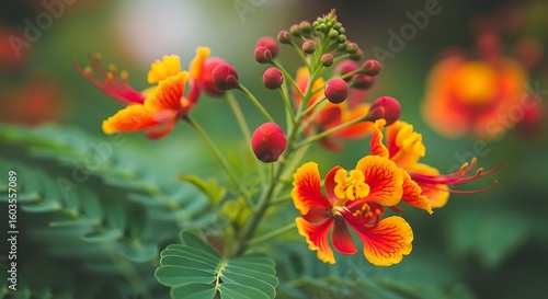 Vibrant Pride of Barbados Flowers in Full Bloom, showcasing vivid colors against a soft green