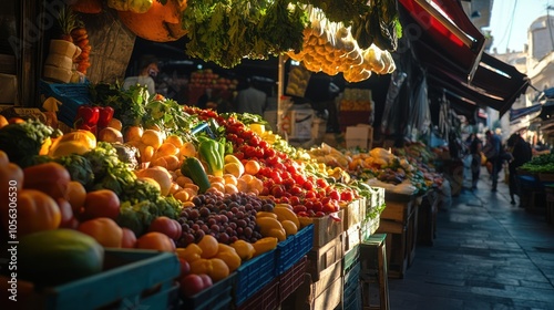 fruit, vegetable, market, produce, stall, racked, fresh, food, organic, healthy, colourful, farmer, grocery, shopping, greengrocer, local, vitamin, agriculture, retail, wholesale, diet, nourishment, ripe, harvest, season, store, merchant, seller, client, street, city, urban, sun, daylight, sunny, bright, shadow, light, perspective, depth, view, angle
