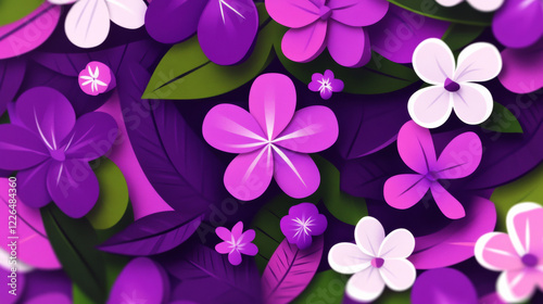 Vibrant purple and pink floral pattern with green leaves