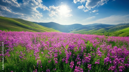 flower, field, purple, nature, landscape, sky, sunlight, plant, bloom, grass, scenic, meadow, spring, calmness, vibrant, beautiful, flora, hill, colours, park, rural, environment, sunny, blossom, background, scenery, fresh, seasonal, daylight, growth, relaxation, high-coloured, summer, picturesque, bright, colourful, natural, harmony, peaceful, view, beauty