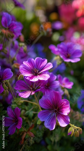 Vibrant purple geranium flowers bloom in soft focus, showcasing delicate petals and rich color against a blurred garden background of green and soft hues.