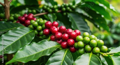 Vibrant Red and Green Coffee Cherries on Branch, Illustrating Ripening Cycle in Lush Plantation