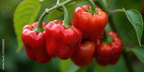 Vibrant Red Bell Peppers Hanging on a Lush Green Plant, Displaying Their Juicy and Fresh Appearance, Ready for Harvest