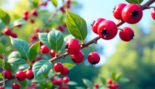 berry, red, tree branch, green, leaf, nature, fruit, plant, botanical, seasonal, fresh, garden, sunlight, closeup, vibrant, colourful, summer, organic, healthy, growth, agriculture, harvest, natural, beauty, wild, rural, sunny, bright, juicy, ripe, vegetarian, snack, decoration, favor, diet, ingredient, herbal, environment, foliage
