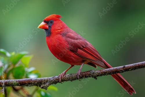 bird, red, cardinal, perched, tree branch, nature, wildlife, plumage, vibrant, colours, forest, green, background, outdoors, closeup, detail, feather, wing, beak, eye, profile, photo, portrait, bright, high-coloured, sharp, sharpened, smooth, texture, spring, summer, autumn, foliage, beauty, animal, songbird, blood-red, dark, natural, image, photo