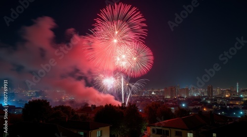 fireworks, city, night, skyline, vibrant, red, celebration, new, year, festive, colourful, illuminated, glowing, joyful, exciting, beauty, sky, event, holiday, spark, bright, cheerful, urban, night time, wonder, light, magical, atmosphere, sparkling, happiness, thrilling, decoration, peaceful, energetic, cheer