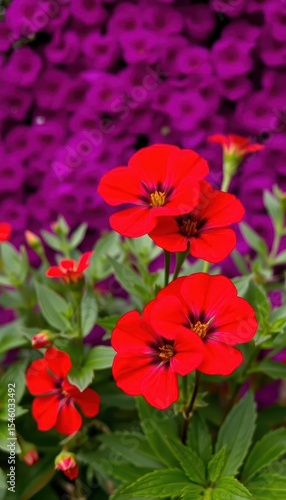 Vibrant red portulaca blossoms against a rich purple backdrop, colorful, closeup, bright