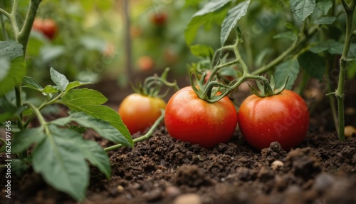 Vibrant red tomato plant with five green tomatoes in urban garden. Rich soil and lush green leaves surround the plant. Tomatoes grow in garden with soil and foliage.