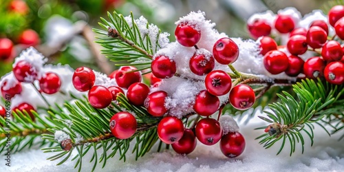 Vibrant scarlet berries burst forth from a snow-dusted pine branch, radiating festive energy and spreading holiday
