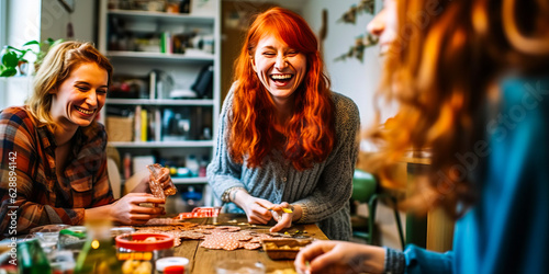 Vibrant scene of joyous redhead friends enjoying a festive game night at home, sharing laughter and snacks. An encapsulation of togetherness and simple pleasures. Generative AI