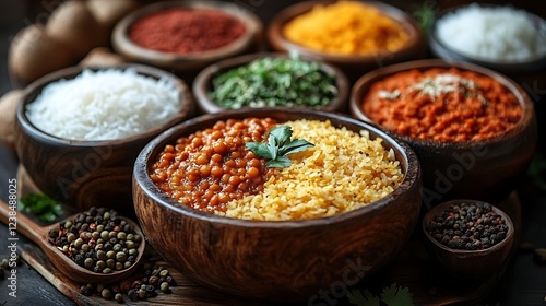 Vibrant Spices and Lentils in Wooden Bowls Garnished with Fresh Herbs Against Kitchen Background