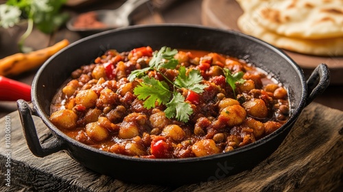 Vibrant spicy Indian fried curry with chickpeas garnished in coriander, accompanied by fluffy bhature on a rustic wooden table