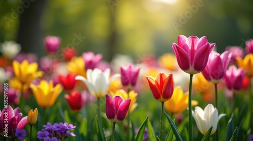 vibrant, spring, tulip, bloom, colourful, garden, pink, yellow, white, flower, sunrise, nature, flora, flower petals, bright, landscape, season, fresh, beauty, field, outdoors, sunlight, growth, green, botany, park, natural, scenery, serene, delicate, blossom, radiant, environment, daylight, picturesque, lush, horticulture, freshness, sunlit, awakening, calmness, kaleidoscope, botanical, peaceful