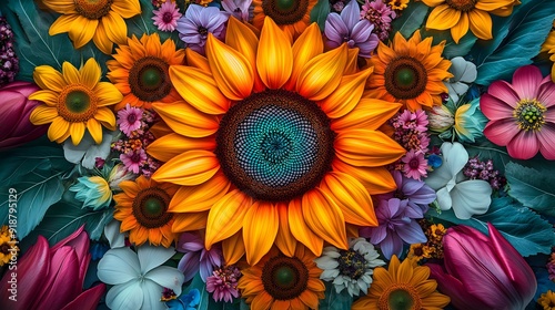 sunflower, sunflower, yellow, orange, flower, bouquet, floral, bloom, blossom, nature, spring, summer, garden, wildflower, flower petals, pollen, green, teal, blue, purple, pink, red, white, beauty, natural, closeup, macro, texture, abstract, art, design, background, decoration, colourful, bright, happy, joy, life, growth, botanical, flora, photo, image, digital artwork, graphic, illustration