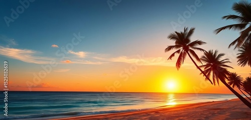 Vibrant sunset over calm turquoise ocean, palm trees silhouette on sandy beach, waves, tropical beach