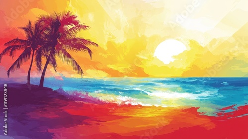 sunset, beach, ocean, wave, palm, tree, tropical, vibrant, colours, sky, sun, sand, water, sea, summer, heat, warmth, holiday, vacation, paradise, relaxation, calm, peaceful, serenity, calmness, escape, freedom, joy, happiness, beauty, nature, picturesque, idylli, scenic, landscape, artwork, painting, art, design, illustration, graphic
